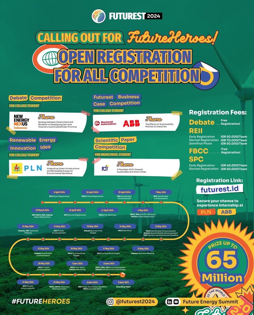 Hello, and welcome to the FUTUREST 2024 🌟 Indonesia’s premier renewable energy summit. Calling all students to join us in pioneering energy transformation through innovation and strategic implementation.